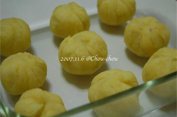 ちょっとしたお茶うけにどうぞ☆砂糖とかの分量はお好みで。シュシュはあまり甘いのは好みではないので、おいも350〜400gに対して、砂糖35g、バター30g、牛乳大さじ2、くらいで作ってみました。でもまだ甘かったです。さつまいもをレンジにかけてつぶす前に味見したらいいかも。甘味の強いさつまいもなら、もっと砂糖とかは少なくてもいいと思います。