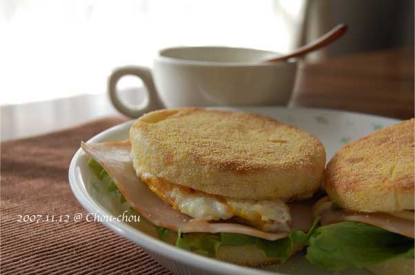 マフィンを焼いて、ハムと卵とレタスを挟みました。ポタージュほかほか。