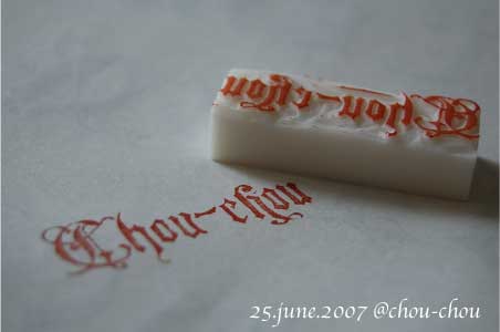 昨日になって、「シュシュ」のつづりが「syu-syu」じゃなくて「chou-chou」だという事に気が付いてしまいました。英語表記とかフランス語表記とかは良く分からないので、こだわらないのですが。。さすがにいい歳こいてスペルミスは恥ずかしいなーと思って変えました。「シュシュ」って何か長ったらしい名前の愛称だったような。。思い出せーん。