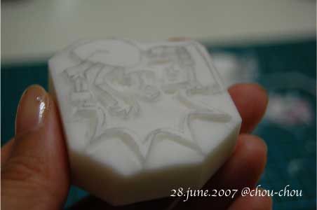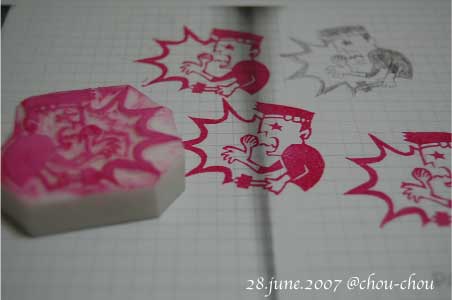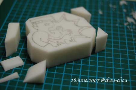 少し深く彫り過ぎたのかもしれません。でもちゃんと彫らないと余白が汚れてしまうし…ってなわけで新しい彫り方を研究してみました。今のところいい感じなのだー☆